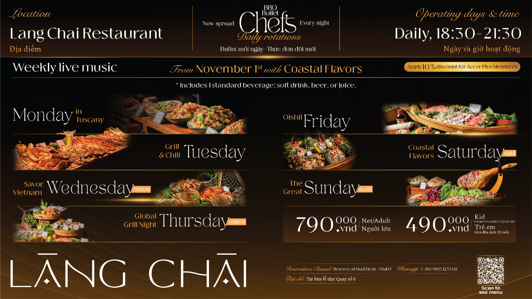Embark on a Coastal Flavors journey every night at Lang Chai Restaurant, where our talented chefs showcase a new themed buffet daily. Each evening offers a unique gourmet experience featuring freshly grilled selections and exciting live cooking stations.